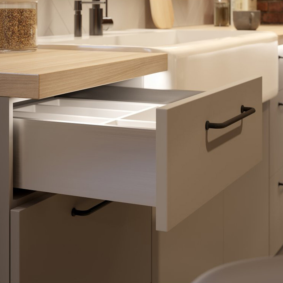 Von Küchenschränken über Badezimmerschränke bis hin zu Büromöbeln, unser Schubladensystem ist äußerst vielseitig einsetzbar. Die 8 verschiedenen Längen und 5 Höhen ermöglichen es, für jede Art von Möbelstück die passende Lösung zu finden. Die einfache Höhen-, Neigungs- und Seitenverstellung bietet maximale Flexibilität bei der Anpassung an individuelle Bedürfnisse. Unsere 3D-Verstellmöglichkeit ermöglicht eine präzise Anpassung in jeder Dimension, um sicherzustellen, dass das Schubladensystem perfekt in Ihr Möbelstück integriert ist. Die 13mm schmalen Schubladenzargen und der Vollauszug sorgen für eine maximale Nutzung der Schublade.