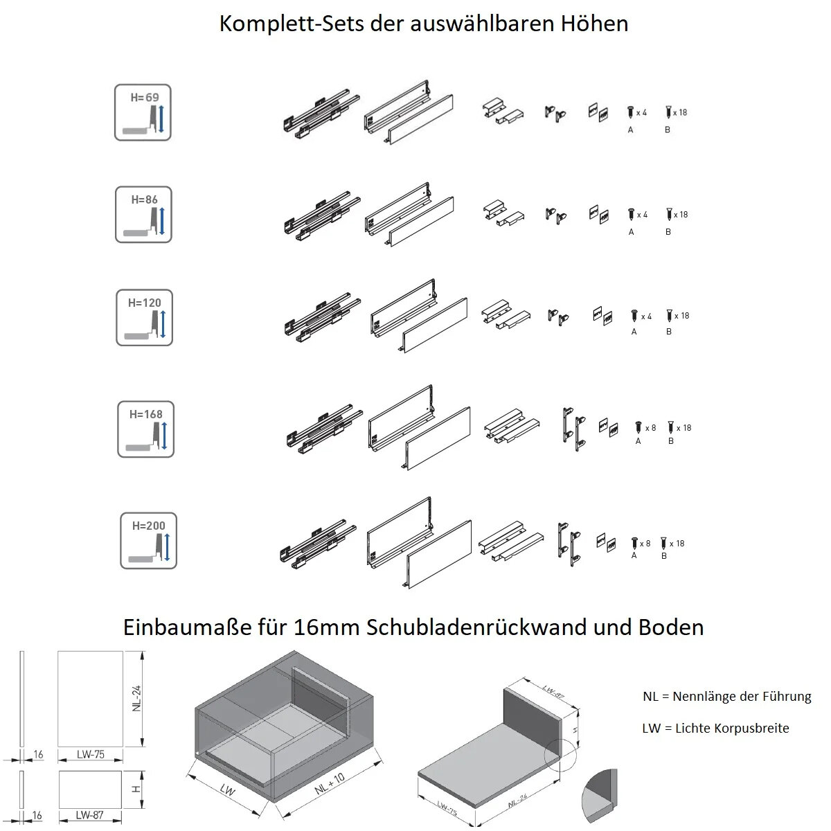 - 69mm Höhe (Backofenschubladen) nur in der Nennlänge 450mm und 500mm erhältlich