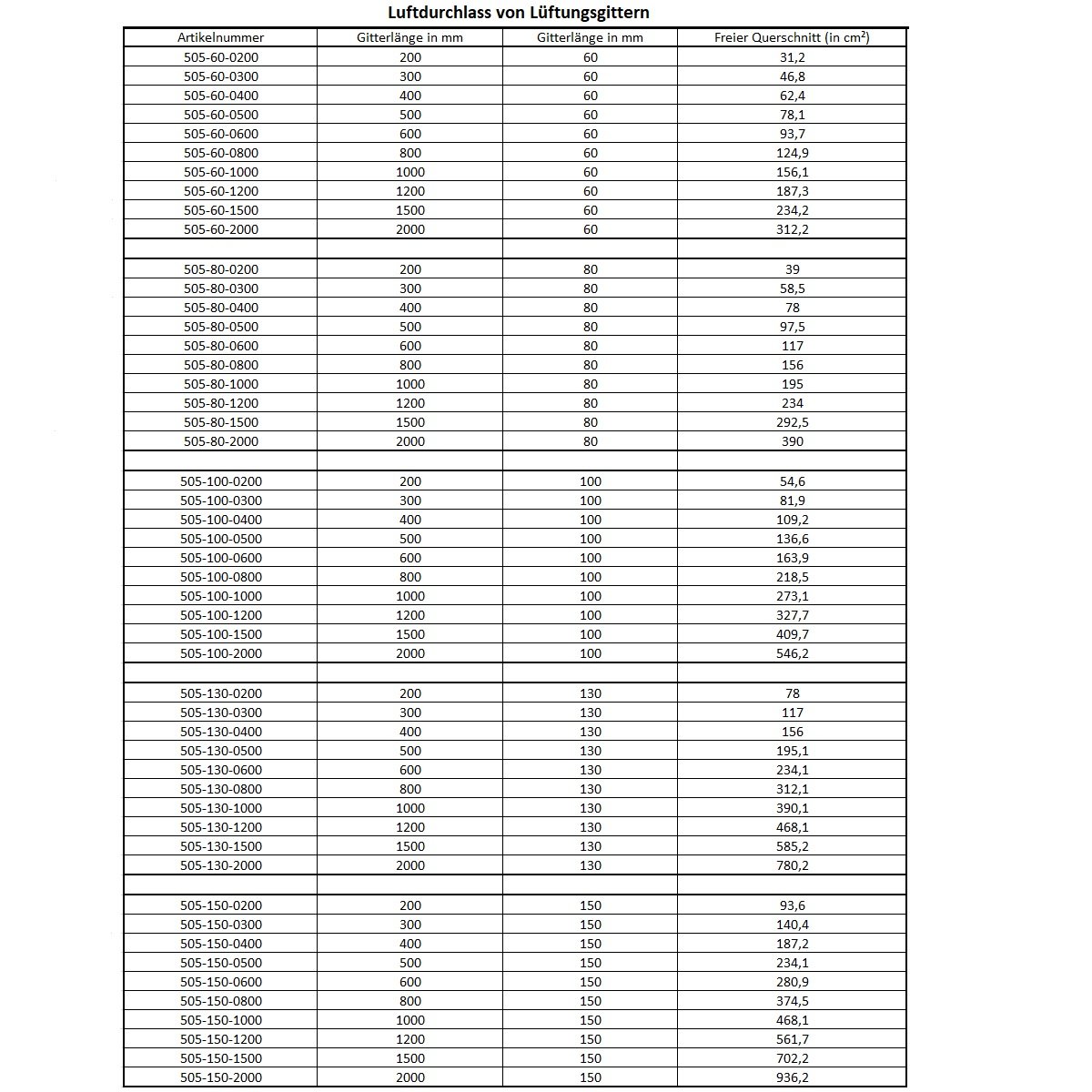 • Luftdurchlass finden Sie auf dem Produktfoto mit der Luftdurchlass-Tabelle